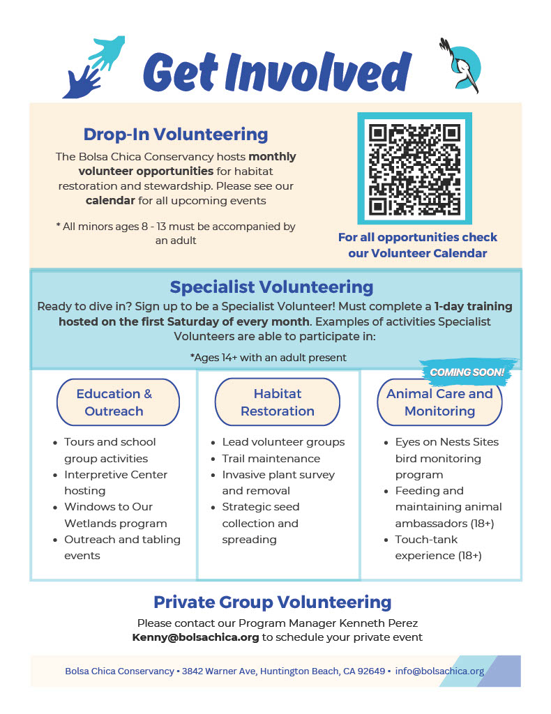 - Help us to restore native habitats at Bolsa Chica by removing invasive plant species and installing native plants. Restoration volunteers will get a chance to clean up our wetlands with trash pick-ups and even occasional kayak clean-ups. Restoration volunteers may also help with growing native plants and educating the public.